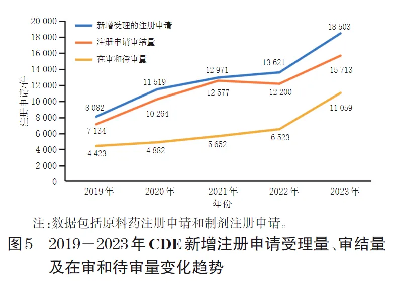 审评队伍规模的发展速度落后于产业发展速度,导致审评员囿于繁重的审评工作任务,无法及时回应产业的发展诉求。根据国家药品监督管理局发布的《2023年度药品审评报告》,从2019年开始,CDE每年的注册申请受理量均大于当年的注册申请审结量,审评积压出现明显的抬头趋势(图5)。审评资源的紧缺已成为制约我国医药产业发展的重要因素之一,我国亟须加快人才队伍建设。
