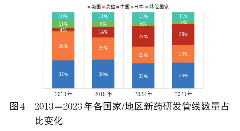 在审评审批加速与投资市场的催化下,我国医药企业创新研发迈入了增长的快车道,历经多年发展后,我国医药企业研发规模已经位于世界前列。据艾昆纬(IQVIA)2024年对全球新药研发的调查报告显示,根据企业总部所在国/地区进行统计,我国医药企业研发管线数量占比已从2013年的4%增长至2023年的28%(图4),2023年的管线数量占比已经超越欧盟,仅次于美国,位居世界第二。