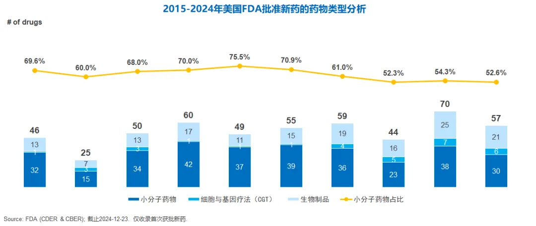 在FDA新药批准中,小分子药物表现依旧亮眼。截止12月23日,美国FDA已经批准57款新药,其中30款为小分子药物,占比超过50%。这一比例在过去近十年中平均为63%,最高达到75%,足以证明小分子药物在新药研发中的基础地位。