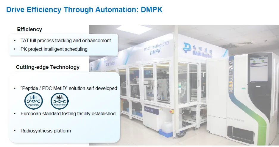 除了提供一体化解决方案,采用自动化设备优化流程,正在成为提升药物研发效率和成功率的重要趋势。例如,在生物分析领域,多家公司已开始采用自动化样品处理和数据分析系统,以实现超高精度的药物代谢与毒性研究。一些领先的研发平台,如药明康德,已通过飞克级(10⁻¹⁸)精度的技术,能够识别药物在体内的分解方式、毒副作用及潜在安全风险,这为药物设计的优化和研发成功率的提高提供了坚实基础。