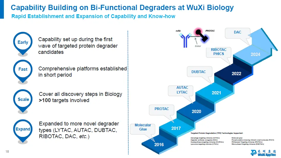 此外,药明康德还通过DEL技术平台(DNA-encoded library)进一步推动蛋白降解疗法的发展。DEL通过将化合物与特定DNA标签相连接,结合高通量筛选技术,可在短时间内快速识别具有潜力的候选分子,大幅提高药物发现的效率和精确性。