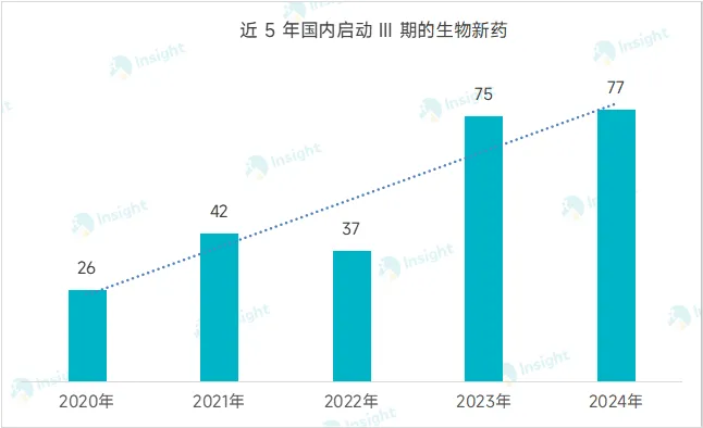 新药研发中,生物药是企业布局的重要方向,并在近年来保持增长趋势。Insight 数据库显示,在 2024 年,共计有 77 款在研生物药新药(含改良新)在国内首次进入 Ⅲ 期(含 Ⅱ/Ⅲ 期)临床阶段,创近 5 年来新高。