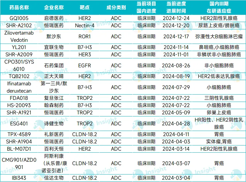 从企业维度来看,恒瑞启动的 Ⅲ 期最多,有 4 款 ADC 在去年挺进 Ⅲ 期,分别为: