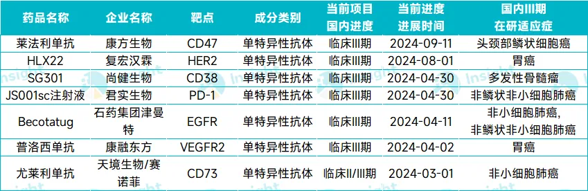 去年进入 Ⅲ 期第 2 多的生物新药是单抗,有 7 款。这些单抗的靶点包括 CD47、HER2、CD38、PD-1、EGFR、VEGFR、CD73,开发的适应症涵盖了胃癌、肺癌、头颈部鳞状细胞癌、多发性骨髓瘤。