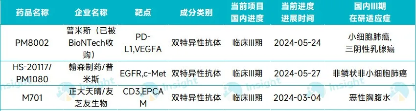 普米斯(已被 BioNTech 收购)开发的 PD-L1/VEGF 双抗 PM8002 在去年 5 月首次启动 Ⅲ 期(CTR20241802),用于三阴性乳腺癌一线治疗,成为了全球首个进入 Ⅲ 期的 PD-L1/VEGF 双抗。此外,该药还在去年 9 月启动了一项用于小细胞肺癌二线治疗的 Ⅲ 期(CTR20233984)。