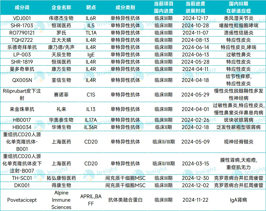 从成分类别来看,单抗类药物最多,有 15 款。其中,又以自免领域热门靶点 IL4R 最多,去年有 5 款 IL4R 单抗在国内进入 Ⅲ 期。