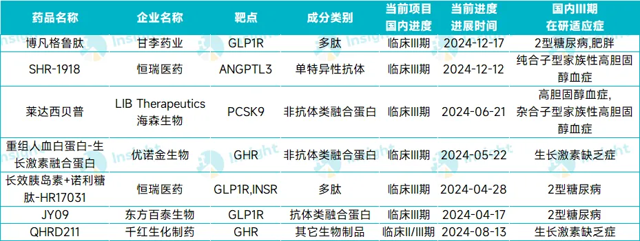 此外,2024 年进入 Ⅲ 期临床的生物药新药还涉及神经系统疾病、呼吸系统疾病、眼科疾病等领域,限于篇幅,本文不再一一介绍。