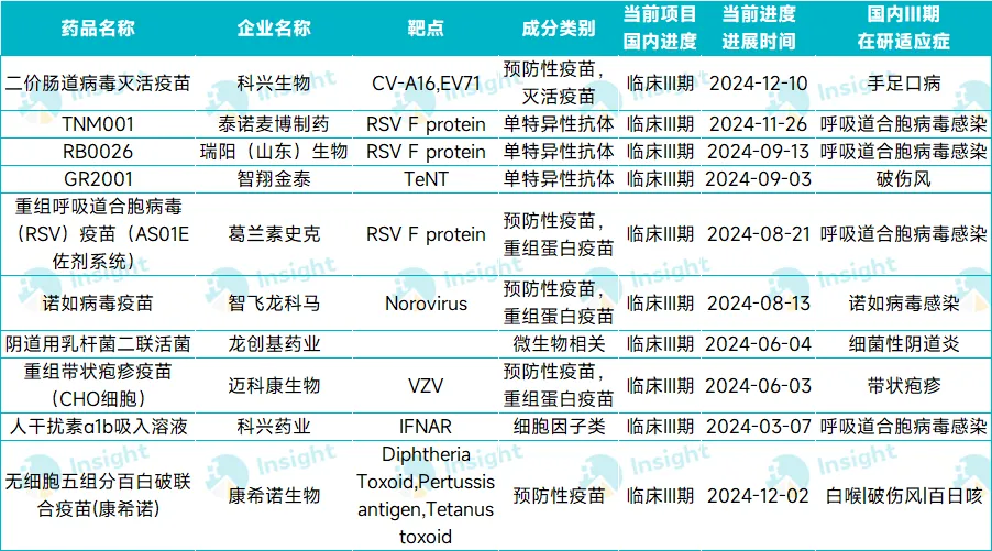 感染性疾病领域有 10 款药物进入 Ⅲ 期,其中包括 5 款疫苗、3 款单抗,来自科兴生物、泰诺麦博、瑞阳(山东)生物、智翔金泰、GSK、迈科康生物、康希诺生物等公司,研究适应症涉及呼吸道合胞病毒(RSV)感染、手足口病、破伤风、诺如病毒感染等等。