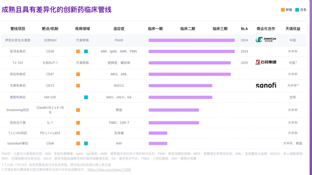 其次,管线版图得到了进一步拓宽,数量和质量均得到了一定程度的提升。目前,天境生物(TJ Bio)拥有11款临床阶段的管线,已经从主要关注肿瘤治疗的1.0时代,过渡到一个更多元化的2.0时代。