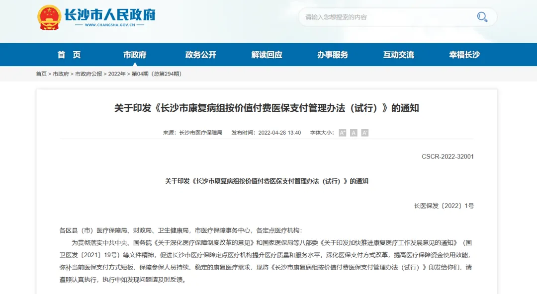 2022年4月,长沙市医疗保障局率先推出“康复病组按价值付费(FRG)”这一全新的医保支付方式,纳入颅内出血性疾患、脑缺血性疾患-梗死型等15个康复病组,覆盖疾病康复全周期,强调恢复患者的功能,鼓励医疗机构注重治疗效果。该举措降低了患者的医疗费用负担,提升了医保资金使用效率,实现了“医、患、保”三方共赢。