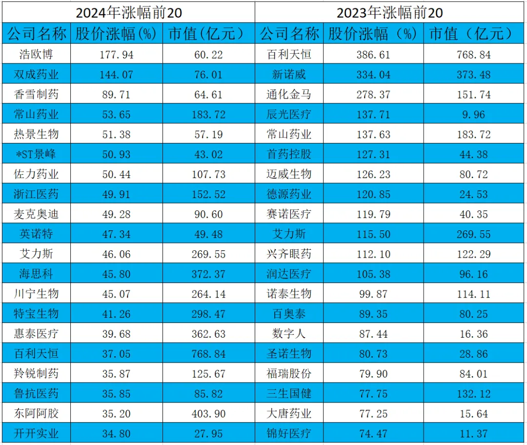 对比2023年和2024年涨幅TOP20,只有常山药业、艾力斯和百利天恒3家公司连续两年入榜,