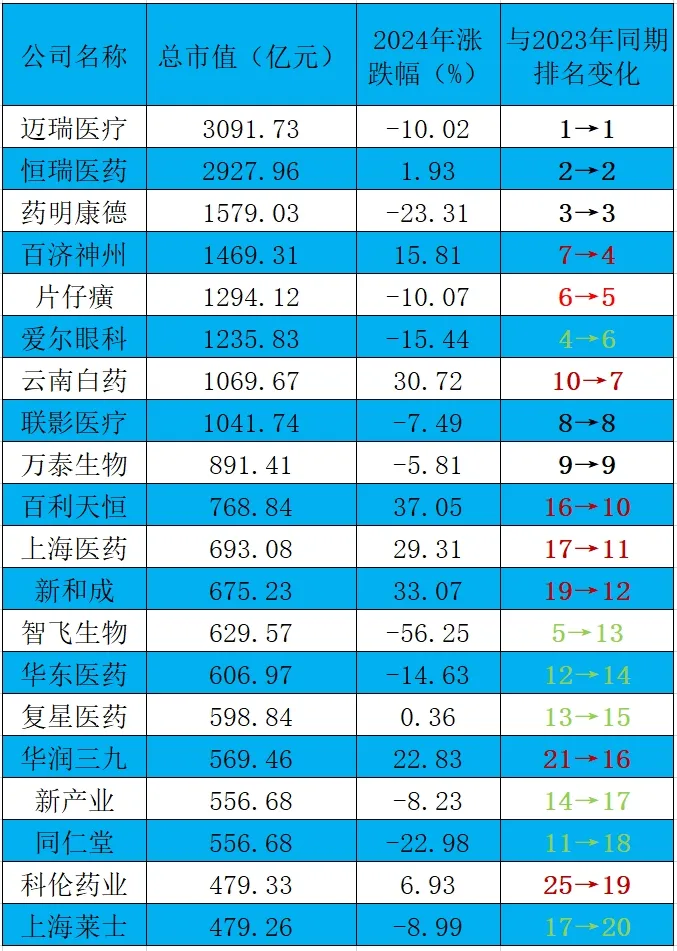 2024年,医药股市值TOP20合计总市值2.12万亿元,较2023年的2.33万亿元,缩水9%。其中千亿市值医药股有八家,分别是迈瑞医疗、恒瑞医药、药明康德、百济神州、片仔癀、爱尔眼科、云南白药和联影医疗。