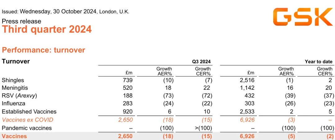 目前全球范围内共上市三款RSV疫苗,分别为GSK的Arexvy、辉瑞的Abrysvo和Moderna的mRESVIA(mRNA-1345)。其中,GSK 2024 Q3财报显示,Arexvy 2024年 Q3共营收1.88 亿英镑(约合2.45 亿美元),同比下滑72%。