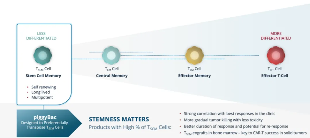 图注: Poseida公司开发了一种特有的CAR-T产品,主要由分化最早阶段的 T 细胞组成,称为T-scm细胞。T-scm细胞寿命长、能够自我更新,且具备多分化潜能,能够重建整个T细胞亚群,包括 T-eff细胞。临床试验表明,它们有可能在输注给药后存活数年,从而提供长期疗效。