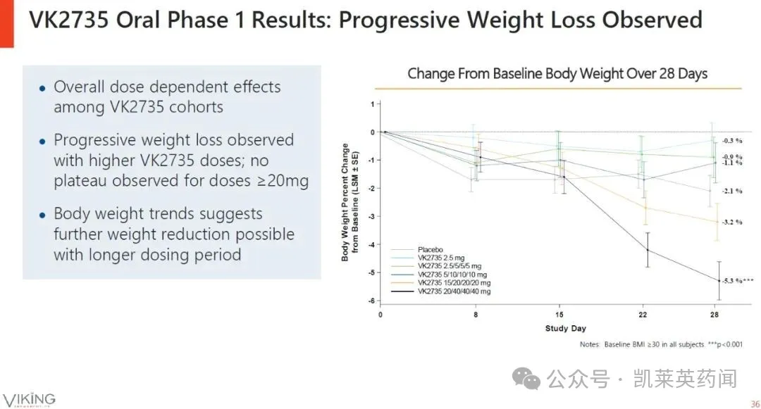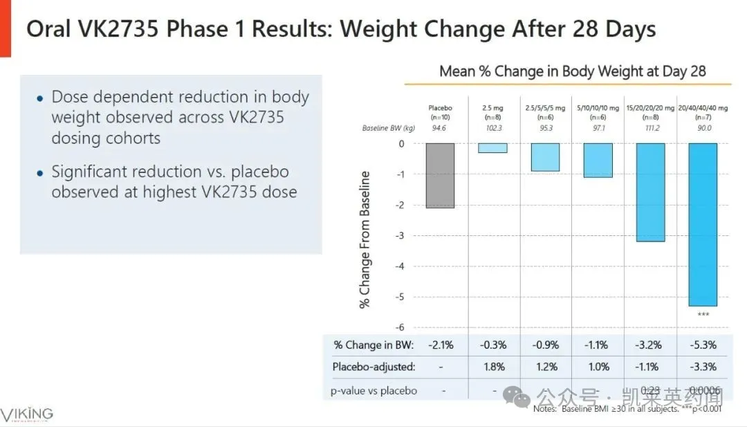 探索性评估在28天后至少达到体重减轻5%的受试者,其中57%接受最高剂量VK2735治疗的受试者实现了≥5%的体重减轻,而安慰剂组这一数值则为0%。