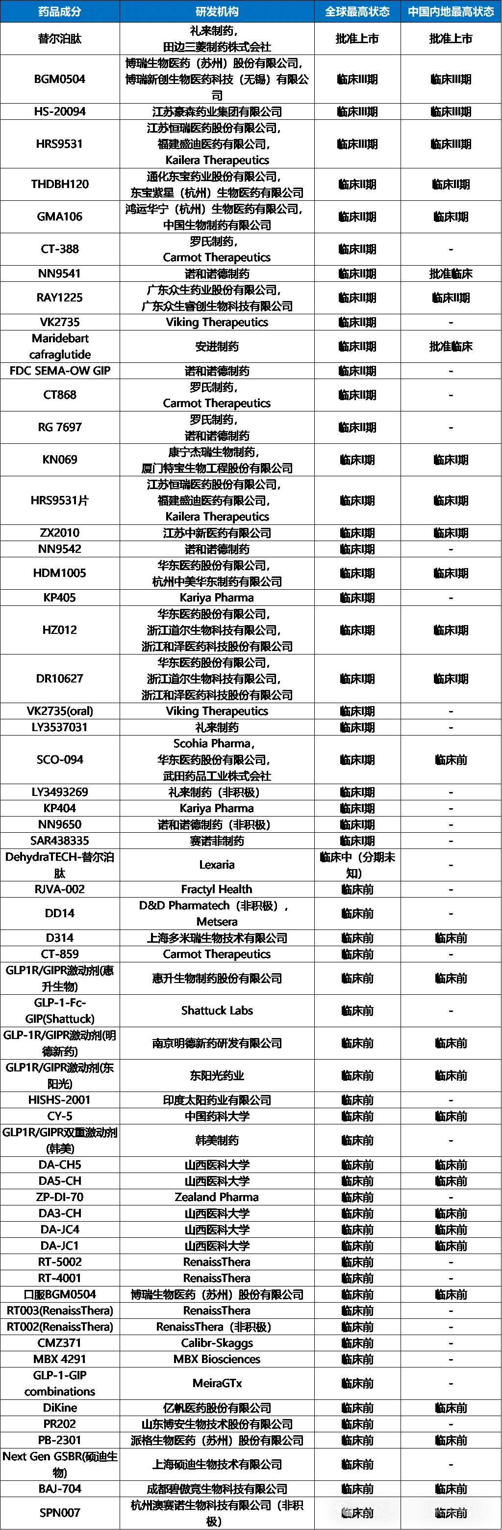 据不完全统计,在研的GLP-1/GIP双靶点治疗药物约60余种。