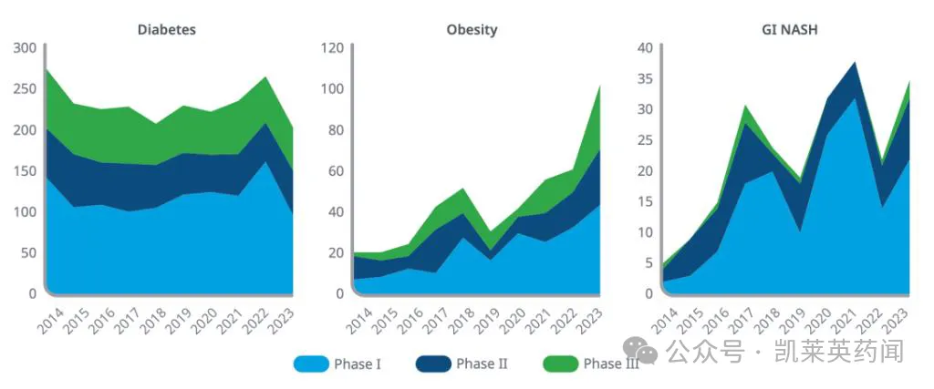 根据IQVIA 发布的报告,2023 年针对肥胖症的临床试验相较2022 年同比增长了68%,与五年前相比增加了将近一倍,尤其是GLP-1R 药物赛道日趋拥挤。
