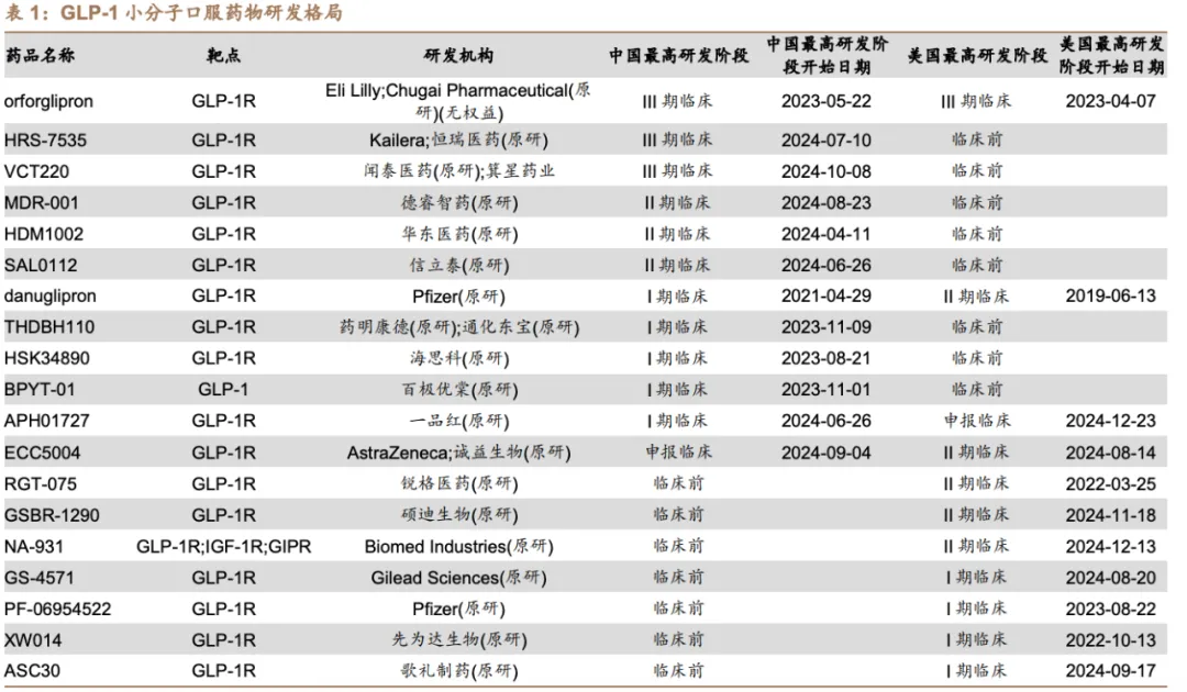 纵观全球小分子GLP-1药物赛道,大多数布局来自国内药企。恒瑞医药的HRS-7535处于3期临床,华东医药的口服减肥药HDM1002片、信立泰的SAL0112处于临床2期,海思科、一品红等处于临床1期。