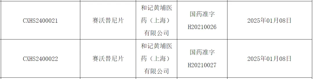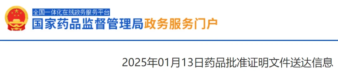 [1] 2025年01月13日药品批准证明文件送达信息. From https://www.nmpa.gov.cn/zwfw/sdxx/sdxxyp/yppjfb/20250113152049169.html
