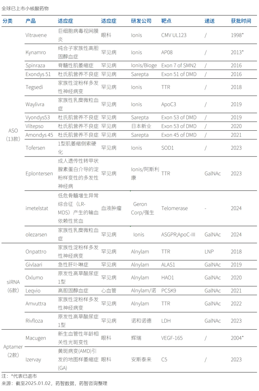 目前全球已经有21款小核酸药物获批上市,6款siRNA药物、13款ASO药物何2况核酸适配体药物。其中以遗传罕见病类目是目前获批最多的适应症类别,目前共有16款小核酸药物是针对遗传罕见病,3款针对眼科疾病,1款针对心血管疾病,1款针对血液肿瘤并发症。