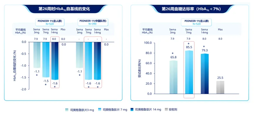 PIONEER 11研究第26周时各组HbA1c降幅及血糖达标率此外,PIONEER