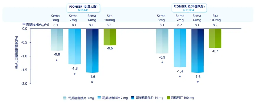 12研究中,3mg、7mg和14mg司美格鲁肽片亦表现出显著的血糖控制效果,其中14mg剂量组中国T2D患者的HbA1c降幅同样达到了1.6%,血糖达标率达到了75.8%。