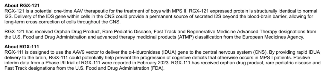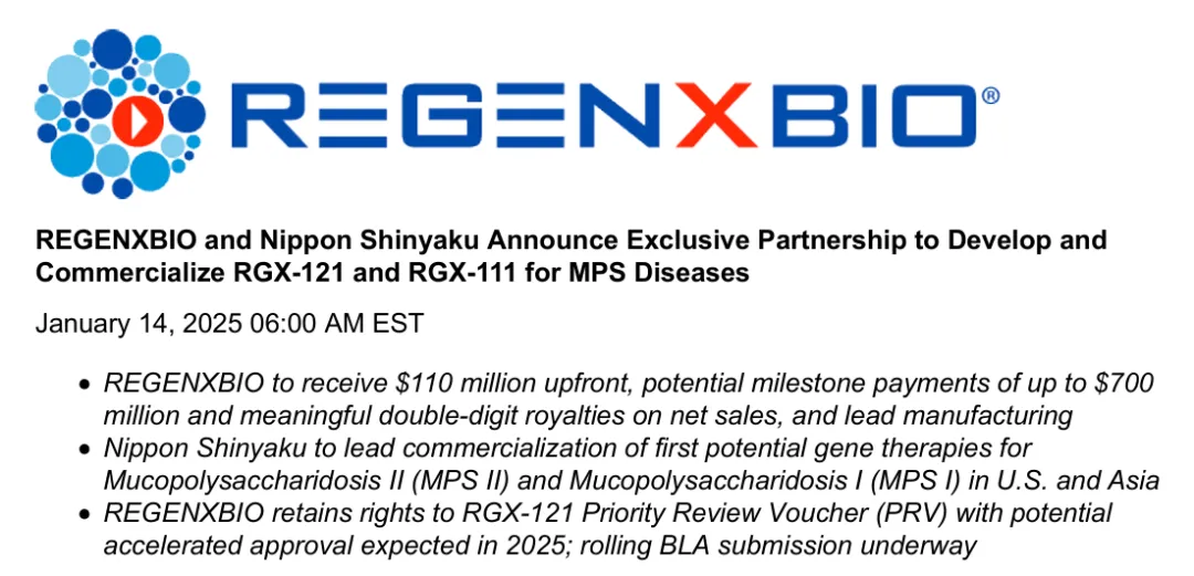 1月14日,REGENXBIO与Nippon Shinyaku(日本新药株式会社)达成战略性合作,携手推进RGX-121用于治疗粘多糖病II(即Hunter综合征)以及RGX-111用于治疗粘多糖病I(即Hurler综合征)的开发与商业化进程。