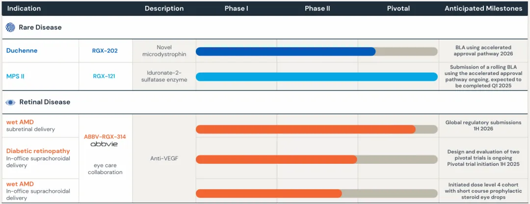 Shinyaku将负责在授权区域(美国及亚洲)内对这两款产品进行商业化运作,而RGX-121和RGX-111后续的临床开发工作将由REGENXBIO主导。REGENXBIO保有对RGX-121优先审评券(PRV)的全部权益,以及在获得潜在批准后,与销售相关的全部收益。预计RGX-121将在2025年获得加速批准,目前其BLA申报工作正在积极推进中。