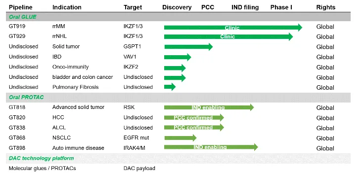 标新生物拥有自主知识产权的E3泛素连接酶配体文库,结合高通量多维度实验数据和人工智能辅助的机器学习模型,指导药物设计。通过湿实验筛选,积累了大量分子胶构效关系的专有知识。其开发的分子胶管线具有高E3连接酶亲和力和高靶点选择性。目前,已有两条产品管线获得中美临床批准,其中GT919和GT929在对应的复发难治血液瘤适应症中显示出疗效,且安全可控,正在进一步临床推进中。