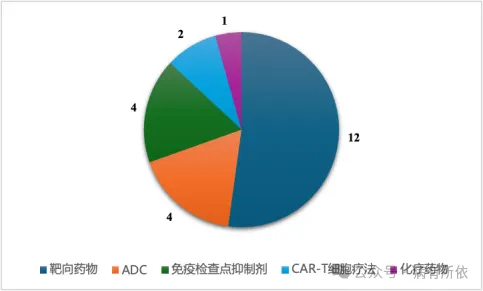 从作用机制来看(见图2),超过半数(52.2%,12/23)为靶向药物,其次为抗体药物偶联物(ADC)(包括替朗妥昔单抗、芦康沙妥珠单抗、索米妥昔单抗和维恩妥尤单抗4个药物),免疫检查点抑制剂(包括莫妥珠单抗、纳武利尤单抗、艾帕洛利托沃瑞利单抗和塔戈利单抗4个药物),CAR-T细胞疗法(包括瑞基奥仑赛和西达基奥仑赛2个药物)和1个化疗药物(紫杉醇口服溶液)。