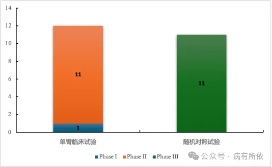 在23个抗肿瘤药物中,有43.5%(10/23)药物通过附条件批准上市。此外,有超过半数(52.2%,12/23)抗肿瘤药物的关键性临床试验为单臂临床试验(Single Arm Trial,SAT)。在所有的SAT中,多数药物的临床试验分期为II期,有1个(8.3%,1/12)药物(匹妥布替尼)的临床试验分期为Ib期。在所有关键临床试验为随机对照试验(Randomized Controlled Trial,RCT)的药物中,临床试验分期均为III期。关键性临床试验分布情况见图3。
