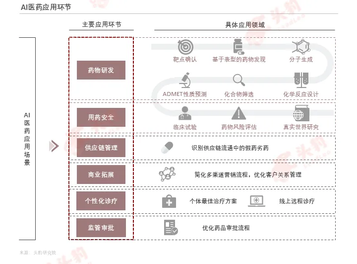 在药物研发阶段,传统的药物靶点识别、药物筛选、分子合成等方式周期长、成本高,因此AI在药物研发领域的应用最为广泛。AI可对大量现有的药物数据进行深度学习,以此分析药物的化学性质和生物活性,更快地设计新药物,预测药物的吸收、代谢和毒性等复杂过程,从而缩短药物研发时间。相较于传统药物研发,AI技术能将药物发现、临床前研究的时间缩短近40%,临床新药研发成功率可从12%提高到约14%。在药品生产领域,通过AI模型的分析和挖掘,企业可以提升药品生产过程检测的效率。在药品营销领域,AI已具备快速分析目标市场和患者画像的能力,可提供药品个性化的营销与药品推荐。
