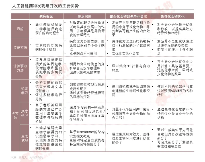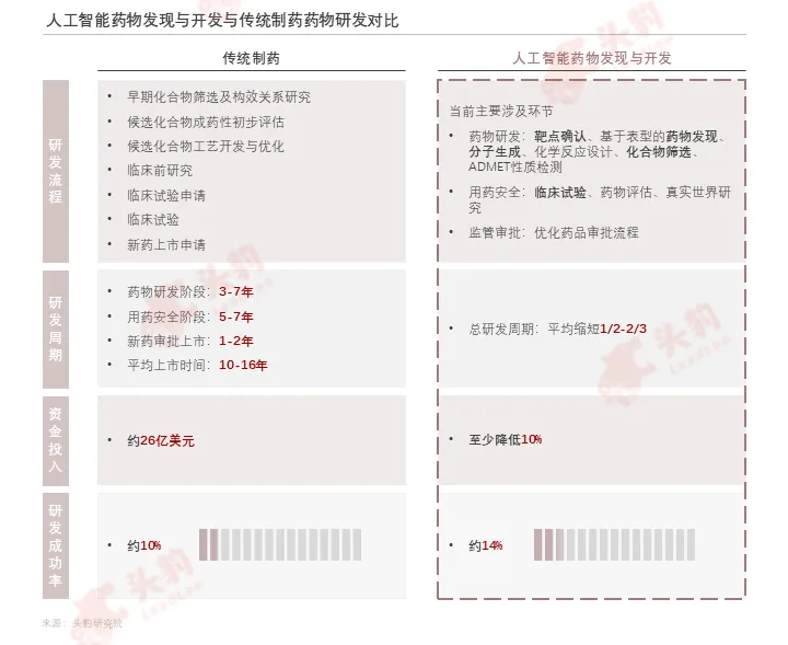 人工智能药物发现与开发通过应用机器学习、深度学习、大数据和自然语言处理等技术,对化合物的结构、药物作用机制、基因等海量数据进行结构化分析处理,快速精准地确定靶点、筛选最佳化合物分子、预测药代动力学性质。人工智能药物发现与开发可大幅缩短药物研发各环节所需周期、降低企业在研发新药时的成本投入,同时提高药物研发的成功率、降低新药研发风险,提升企业的投资回报率,相较于传统制药在新药研发领域拥有绝对优势。