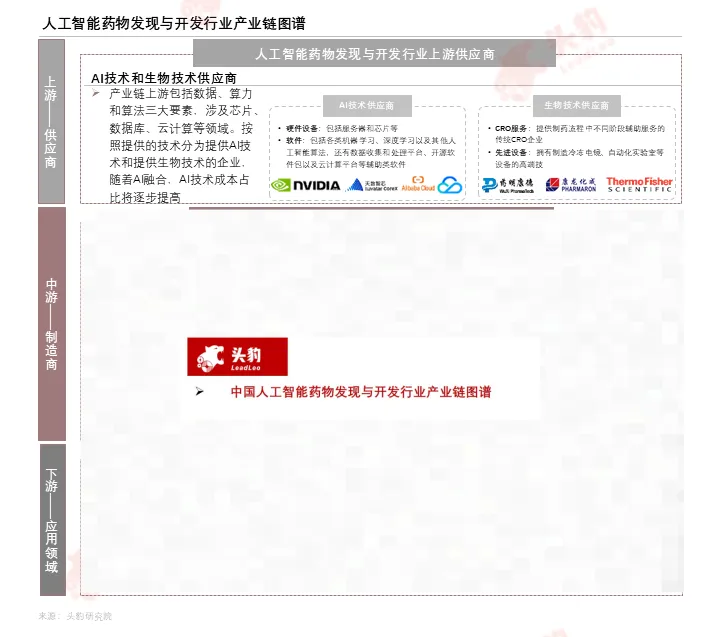 AI在传统制药行业中可应用方向相对较广,因此人工智能药物发现与开发行业产业链所包含的企业类型涉及较广,大致可以分为上游工具层、中游研发层、下游销售层。上游涉及算力、算法和数据,主要分两大类:提供AI技术的企业和提供生物技术的企业;中游是主体部分,主要分为四大类:AI+biotech、AI+CRO、AI+SaaS以及IT头部企业在产业中的均有所布局;下游分为传统药企和CRO企业,传统药企主要通过自建团队、对外投资、CRO及技术合作等方式进入赛道,传统CRO们主要通过风险投资、建立内部算法团队、采用外部AI技术、与中游领域公司进行合作等方式切入该领域。