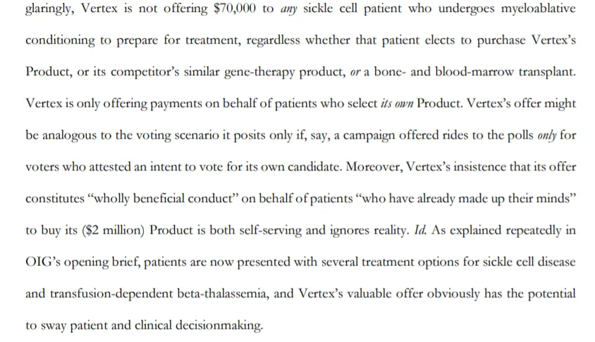 但这一观点很快遭到了HHS方律师的反驳,他们指出Vertex的论点“扭曲了法规的意义”,生物技术公司通过其对先例裁决的解读是在“做无谓的挣扎”,并“试图将不同的法规‘硬塞’到反回扣政策中。