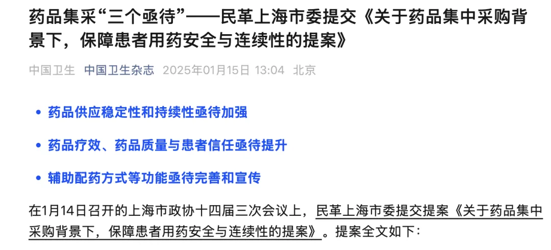 20名政协委员在2025年上海两会期间的联名提案,使集采药品引发热议。