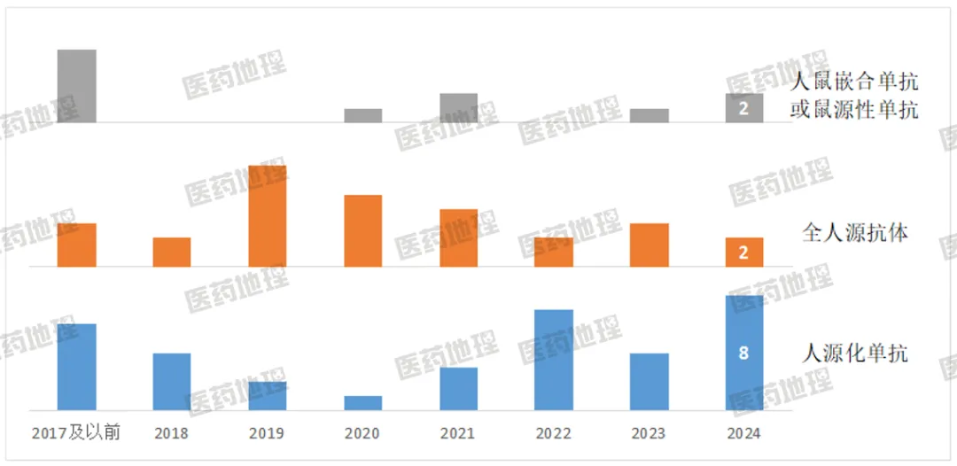 基于Pharma-ONE中国上市药品数据库,统计每一个进口单抗产品(皮下注射单独计数,ADC不计入)的首次获批时间,并按照人源化比例进行分类汇总。2018年是进口单抗获批的增长点,相较于2017年数量翻倍还多,2019年至2023年则稳定维持在8-9个/年,直到2024年NMPA新批准了12个单抗产品,再创历年新高,至今已有76个相关产品获批进口。人鼠嵌合单抗或鼠源性单抗在2017年及以前的早期市场占有一席之地,但近几年较为少见,尤其是鼠源性单抗,2021年至今未有新药;全人源抗体在2019年至2022年更受市场欢迎,如今已被人源化单抗明显超越,同时研发阶段也呈现类似格局。