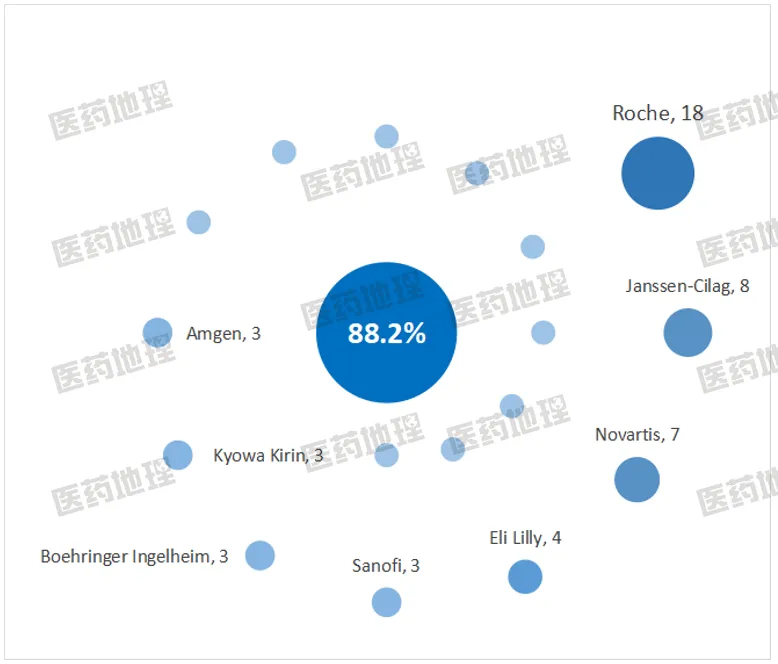 进一步统计上述单抗对应的企业,至少有2个进口产品的企业有17家,对应产品数占所有进口单抗的88.2%。Roche以18个产品遥遥领先,稳居第一,且近五年每年都有新产品获批,近两年每年获批3个。Janssen-Cilag以8个产品位居第二,Novartis的7个紧随其后,两家企业近五年获批的新产品都是3个,分散于不同年份。第三梯队的产品数量是3-4个,Eli Lilly在2024年表现突出,加卡奈珠单抗和多奈单抗分别于1月和12月获批;此外,Boehringer Ingelheim的佩索利单抗在2022年底获批后,2024年一季度其皮下注射制剂也顺利通过了监管机构的审核。