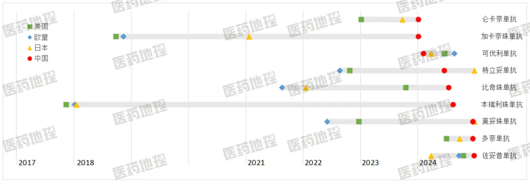 基于Pharma-ONE全球上市药品数据库,统计2024年中国获批的进口单抗(皮下注射和ADC均不计入)在美国、欧盟、日本这三个国家或地区的首次批准时间。在9个单抗中,有2个尚未获得欧盟批准,有1个日本首批,有1个中国首批。四个国家或地区时间跨度最长的超过6年,最短的仅6个多月。