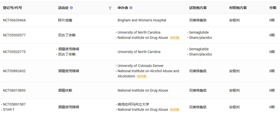 根据 Insight 数据库,目前司美格鲁肽正在进行的成瘾性临床研究数量有 6 项,这些研究都是由大学、研究所、医院发起,适应症涉及阿片成瘾、尼古丁依赖、酒精使用障碍等。