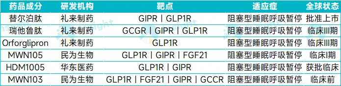 替尔泊肽之外,目前全球还有多款 GLP-1 类药物正在进行 OSA 的开发(见下表)。