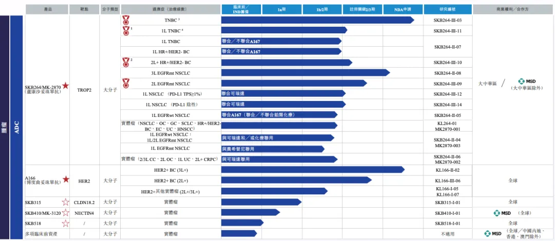 临床管线上,目前公司有10余款产品处于临床阶段。其中,4款产品处于申请上市阶段,均有望于在2025年获批,包括2款核心ADC产品,即SKB264 (TROP2 ADC)、A166(HER2 ADC),及另外2款生物药,即A167 (PD-L1)、A140 (西妥昔单抗生物类似药)。