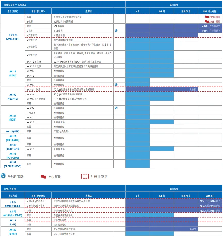 目前,其进入商业化产品有4款:PD-1/CTLA-4双抗卡度尼利(商品名:开坦尼)、PD-1单抗派安普利(商品名:安尼可)、PD-1/VEGF双抗依沃西(商品名:依达方),PCSK9单抗伊努西(商品名:伊喜宁)。