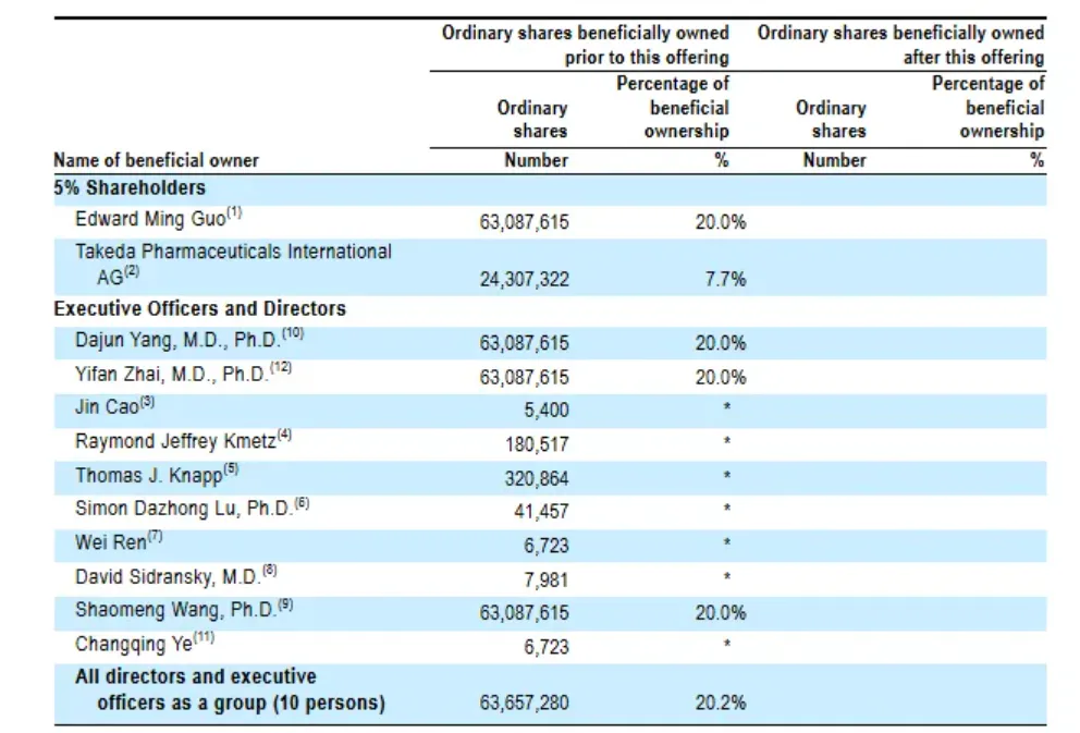 招股书显示,亚盛医药IPO前的主要股东包括:郭明Edward Ming Guo、杨大俊Dajun Yang, M.D., Ph.D.、翟一帆Yifan Zhai, M.D., Ph.D.,、王少萌Shaomeng Wang, Ph.D.等。IPO前,杨大俊等管理层控制19.2%股权,TakedaPharmaceuticals持股为7.71%。