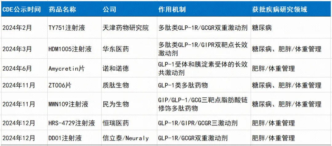 图表:2024年在中国首次获批临床的“GLP-1类”多肽1类新药管线