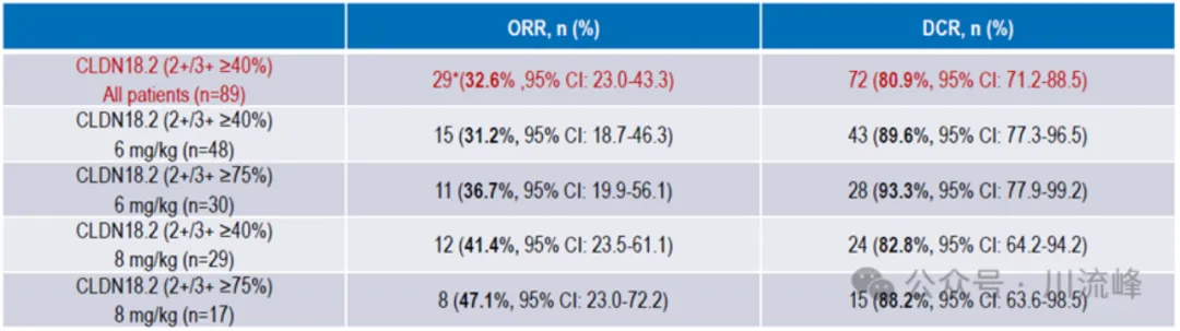 如今的II期临床,可以说是进一步加强了这一证实。在剂量扩展阶段的21名CLDN 18.2表达IHC 2+≥20%的胃癌患者中,ORR为42.9%,DCR为95.2%。其中,9例部分缓解(PR),包括8例确认PR;11例疾病稳定(SD)。在10名claudin18.2表达IHC 2+ < 20%的胃癌患者中,ORR为30.0%,其中一名CR和两名PR。