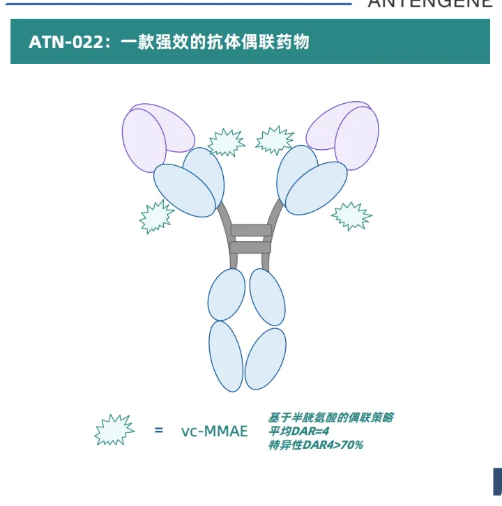 然后说德琪的ATN-022,之所以前面要以信达的IBI343作为铺垫,是因为二者的技术路径不是一个路数。如图所示,其结构来看是VC-MMAE,DAR值为4,在linker和payload上在我们现在的眼中或许不算那么“前沿”,如今这个时代,大家愿意follow的自然都是旁观者效应强的DXD,而第一三共更是在探索毒性更高的PBD。