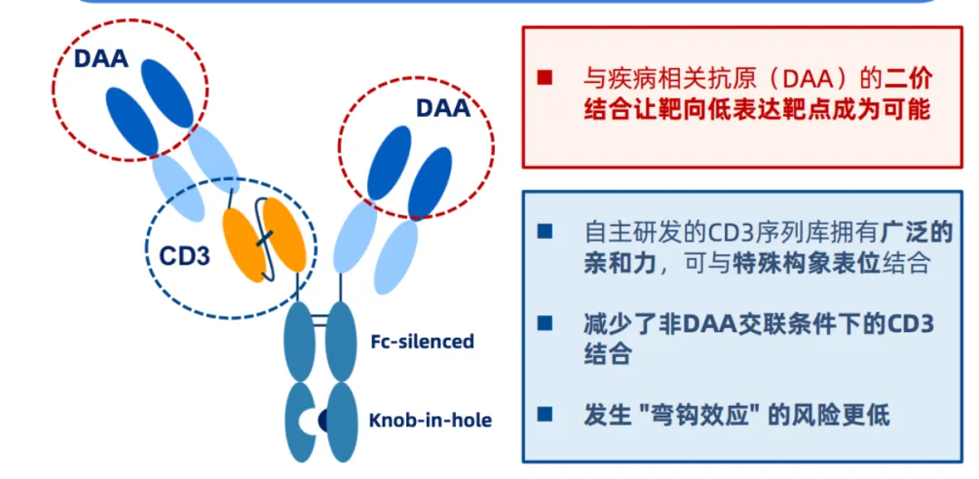 与诸多潜力股biotech类似,德琪也在发展其下一代以多抗为主的技术平台。AnTenGager是典型的TCE双抗/三抗平台,从其官网披露的PPT来看,也是非常目前非常时髦的2+1结构,如图所示,是1+1的普通TCE双抗的下一代产物,抗CD3臂也是放在了典型的中间的位置,通过增加空间位阻的方式减少了抗体与T细胞的偶联,从而提高药物的安全性,减少CRS的发生率,此外,德琪的抗CD3序列也是自主筛选出来的,可以和特殊构象表位进行结合,而大部分TCE平台使用SP34和OKT3这类非专利的CD3序列。