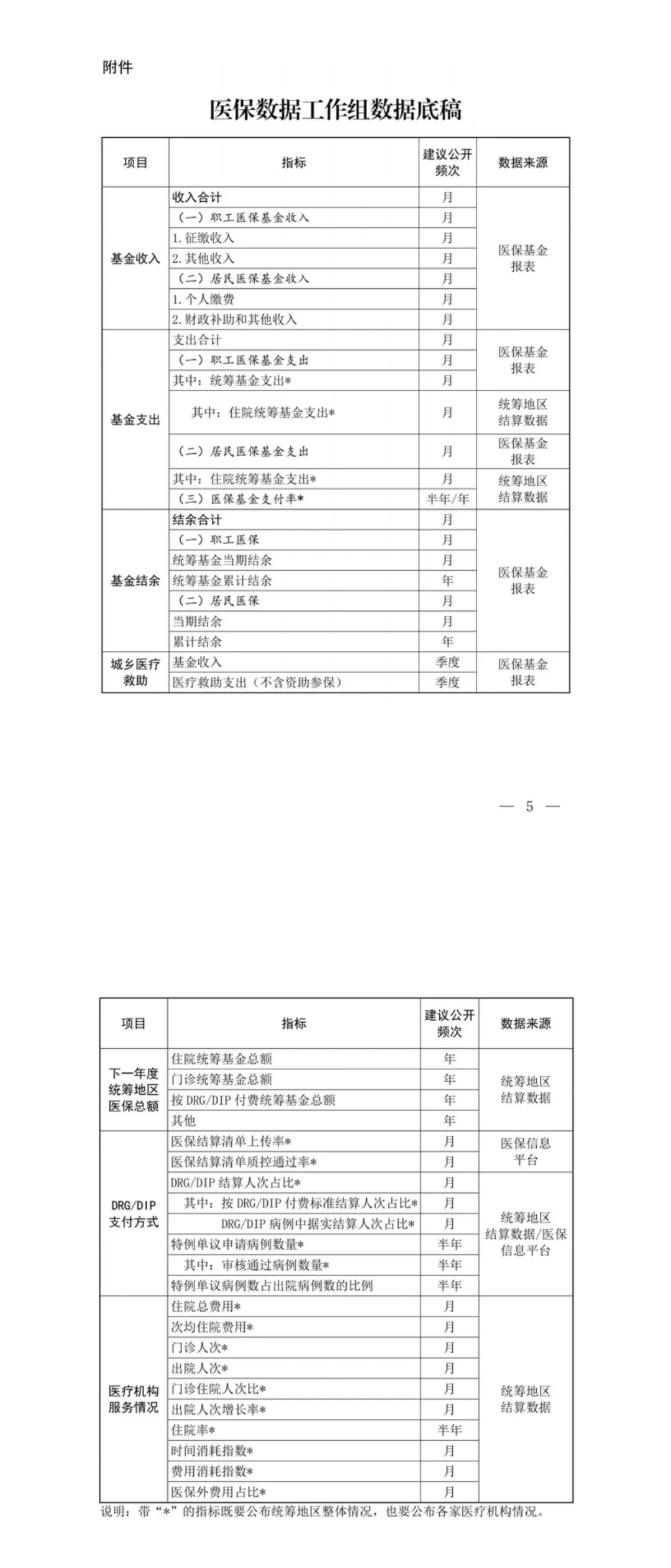 数据工作组面向统筹地区内所有定点医疗机构“亮家底”。数据内容包括医保基金收支情况、预算执行情况、DRG/DIP付费、结算清算进度等(见附件)。数据工作组要根据国家统一要求,按月公布数据,暂时不具备条件的可按季度公布。鼓励地方在国家统一要求的基础上,根据医疗机构需求,细化数据指标,加强对医保基金、医疗机构行为相关数据的公布。