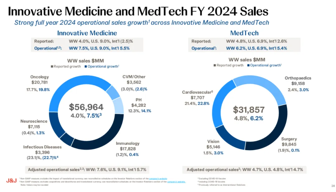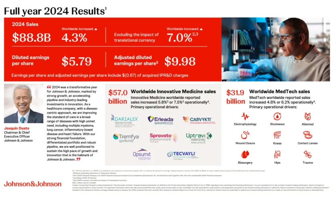 1月22日,强生公布了2024年业绩,全年总营收888.21亿美元,同比增长4.3%。强生旗下两大核心业务板块——创新制药和医疗科技,分别实现了569.64亿美元(+4.0%)以及318.57亿美元(+4.8%)的收入。
